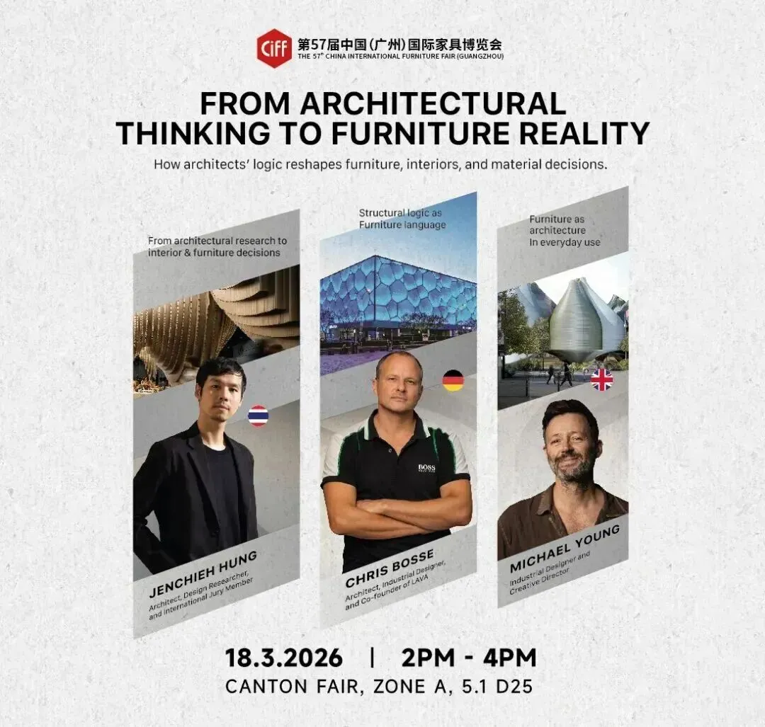 本论坛的核心定位是链接建筑设计、家具设计与内装产业的高端跨界融合平台,特邀水立方设计师Chris Bosse、HAS design and research 主持建筑师/中泰建筑研究室创始⼈Jenchieh Hung、及英国工业设计师Michael Young,以 “建筑语言” 为核心纽带,打破建筑、家具、内装各领域的设计壁垒与产业边界,推动从建筑规划初期到内装落地全流程的一体化设计与供应链协同,同时为建筑、设计、家居行业搭建思想交流、资源对接、标准共建的生态体系,助力高品质人居与商业空间的打造。