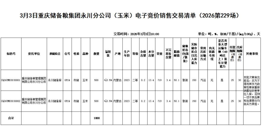 受重庆储备粮管理集团有限公司永川分公司委托,重庆市粮油批发市场有限责任公司(即国家粮食重庆交易中心,以下简称“批发市场公司”),定于2026年3月3日10:00举办重庆储备粮集团永川分公司(玉米)电子竞价销售交易会,现将有关事项公告如下: