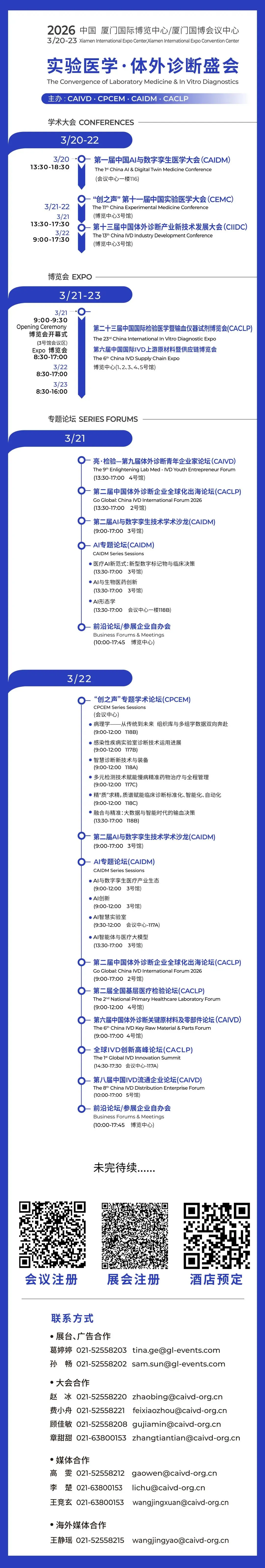 第二十三届中国国际检验医学暨输血仪器试剂博览会、第六届中国国际IVD上游原材料暨供应链博览会将于2026年3月21-23日于厦门国际博览中心盛大开幕,提前登记即享免费入场!