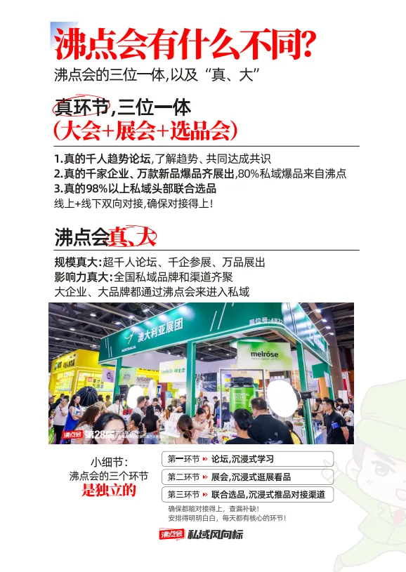 作为私域行业的“风向标”,大会吸引98%的私域头部渠道到场选品,每年80%的私域爆品均出自此处。现场设立四大渠道对接区,汇聚3W+达人MCN机构、私域团长、小红书买手等资源,更有福牌阿胶、自然堂、妙可蓝多等50+头部企业采购负责人面对面洽谈,实现品牌方、渠道方、达人的高效匹配。