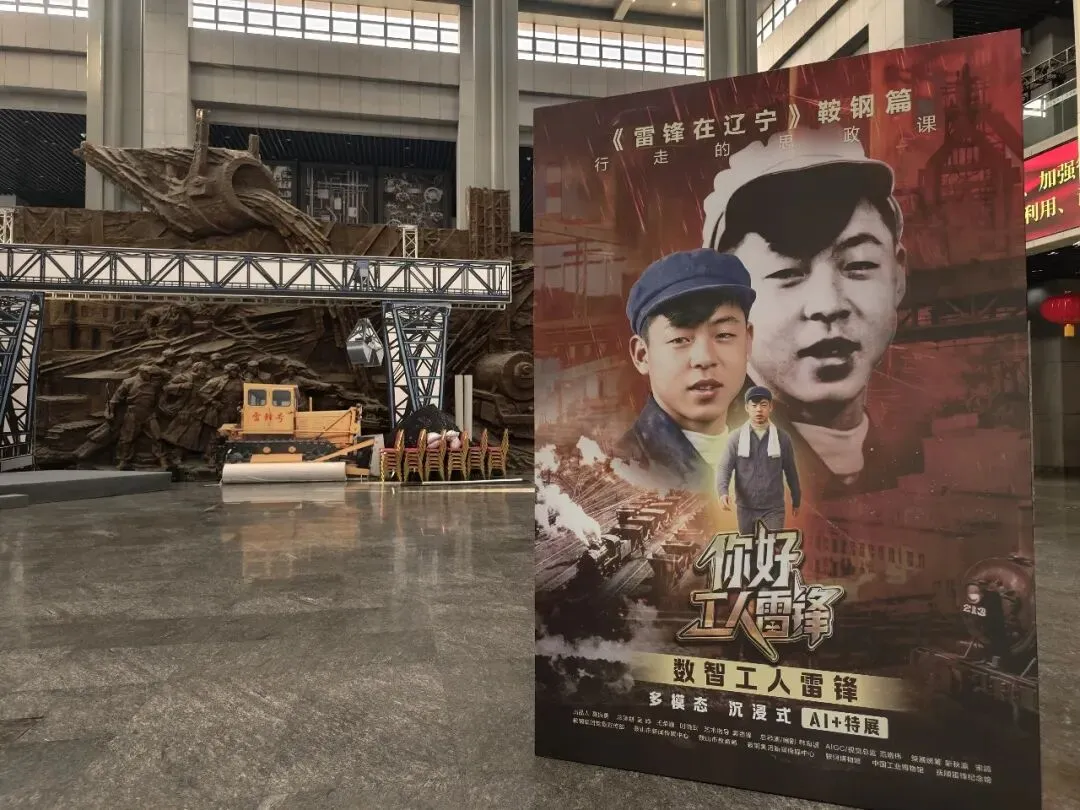 本次展览开幕式上的创新亮点是国内首个“数智工人雷锋”多模态沉浸式展演《你好,工人雷锋》同步亮相。展演将以35分钟情景舞台剧为核心载体,精选雷锋在鞍钢工作期间21个典型场景,通过戏剧演绎与数字科技融合,再现雷锋从一名普通青年成长为工人阶级先进代表的青春岁月。小演员与AI生成的历史场景、大屏数字影像以及“数智工人雷锋”展开跨越时空的对话互动,形成“屏幕内外蒙太奇”的叙事效果。