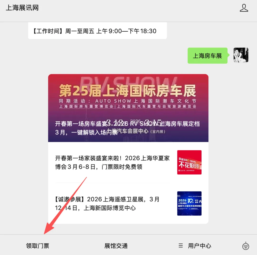 关注“上海展讯网”,点击底部菜单栏“领取门票”,填写个人信息,即可获得免费门票(登记步骤同方式一)。