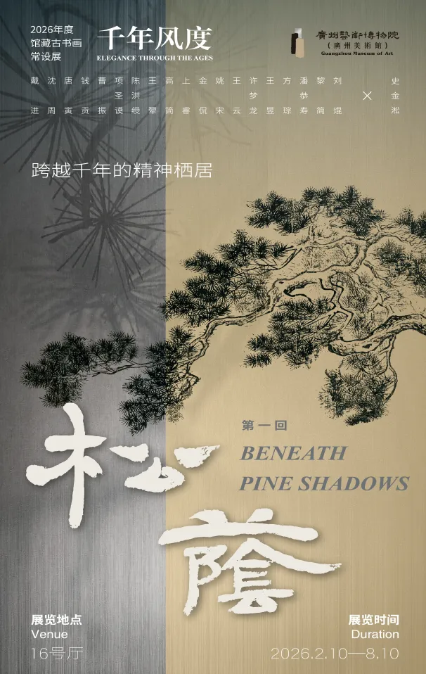 松荫承文脉,古今共风雅。广州艺术博物院全新学术品牌——“千年风度”馆藏古书画常设展开篇之作“千年风度——馆藏古书画常设展之松荫”,以“松”为核心线索,汇集戴进、沈周、唐寅、陈洪绶、项圣谟、王翚等19位明清艺术家的经典书画,与当代艺术家史金淞的“松系列”装置作品展开一场跨越数百年的对话。本次展览的艺术家包括:戴进、沈周、唐寅、钱贡、曹振、项圣谟、陈洪绶、王翚、高简、上睿、金侃、姚宋、王云、许梦龙、王昱、方琮、潘恭寿、黎简、刘焜、史金淞。展览聚焦“松”从古典到当代的持续生成与精神传承,探讨“荫”作为精神调整空间的深层内涵——它并非逃离现实的庇护所,而是一种允许个体在压力间隙中积蓄力量、支撑持续挺立的生命机制,引导观者思考在变动世界中“如何停留”“如何再立”的永恒命题。自魏晋以来,松便逐渐进入文人精神世界的核心语境,成为中国绘画中一个历久弥新、始终活跃的精神母题。在高士图与山林想象中,松既是远离尘嚣的依托之物,也是人格得以自我校准的参照坐标。进入唐宋,随着山水画体系的成熟,松不再只是隐逸情怀的象征,而成为构建山川秩序的重要结构要素:它参与塑造空间的纵深、气势与稳定性,也寄托着士人关于天地秩序与自身位置的理解。至此,松已同时具备了“可居之荫”与“可立之势”的双重意义。◎ 明 · 戴进《山高水长图卷》局部 纸本设色 广州艺术博物院藏