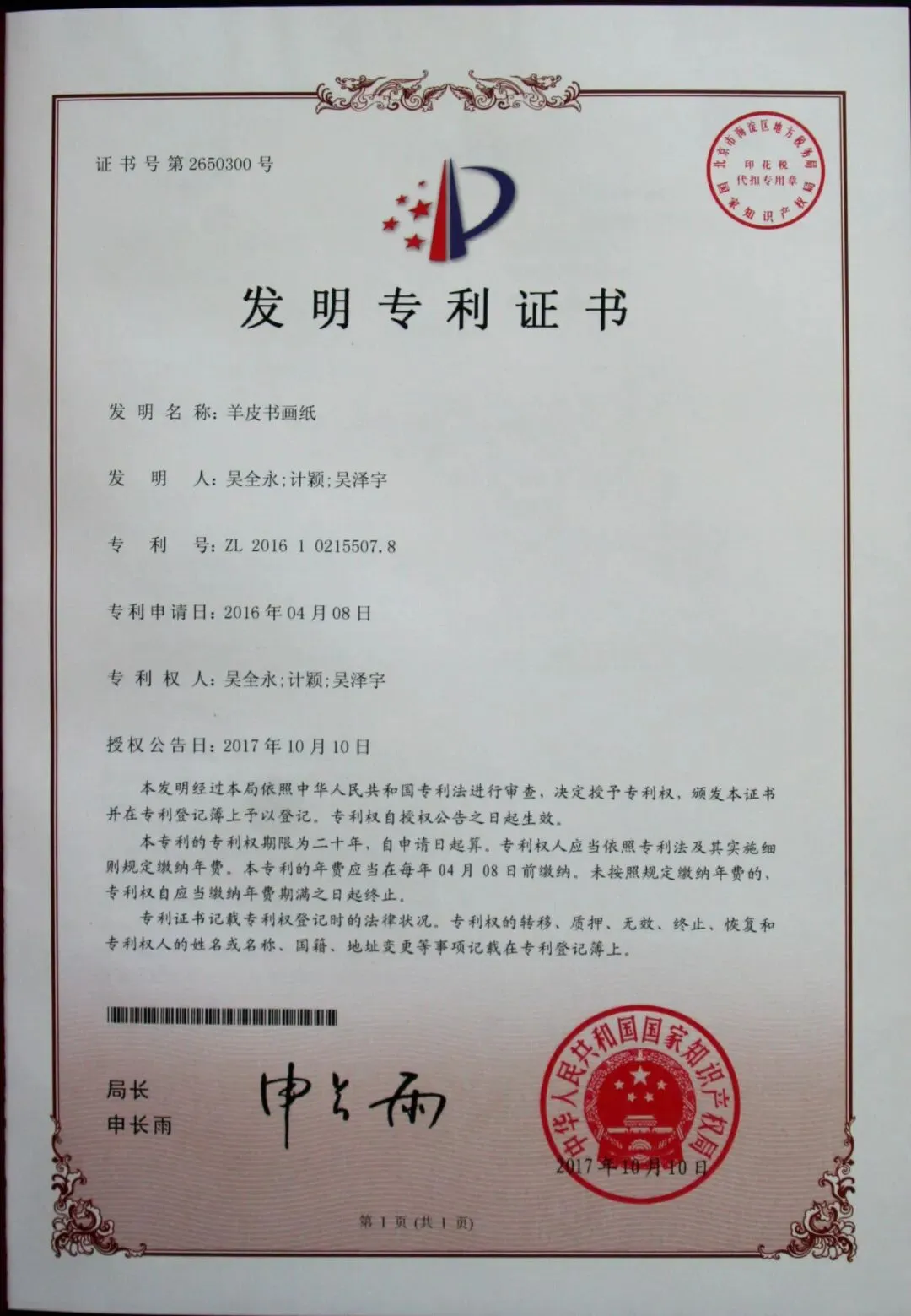 羊皮书画纸获得发明专利