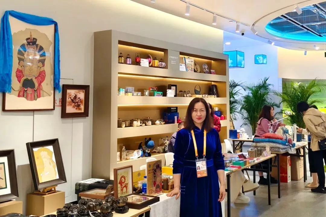 计颖作为非遗计氏羊皮画传承人,她的作品先后被世界技能博物馆、中国工艺美术馆、中国非物质文化遗产馆、阿拉伯联合酋长国家文化活动中心、中国宋庆龄基金会、中华两岸文化交流基金会等国内外机构珍藏。本次计颖受到内蒙古自治区文化和旅游厅邀请,在国家能源集团置业公司的支持下,从内蒙古包头来到上海,共有4幅非遗计氏羊皮画作品展出。作品色彩古朴自然,呈色持久,绘制精细,技法独特,融入现代审美元素和创新思维,不仅重视色彩美,而且注重意境美,形成了独一无二的绘画艺术风格。其中,代表作品《喀尔喀新娘》和《花鸟》各具特色,吸引众多观众驻足打卡,共同交流分享感受。
