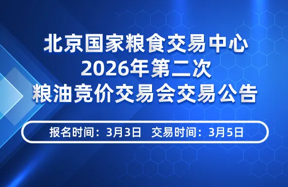 北京国家粮食交易中心(以下简称交易中心)根据北京市粮食和物资储备局下达的轮换计划,接受北京市燕谷粮油购销有限责任公司(以下简称燕谷公司)的委托,定于2026年3月5日9:30在交易中心采用国家粮食交易平台,举办“2026年北京市储备粮油第二次竞价交易会”。现将有关事项公告如下: