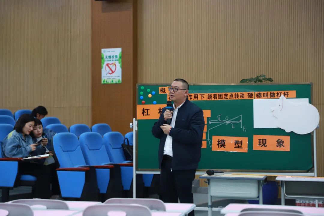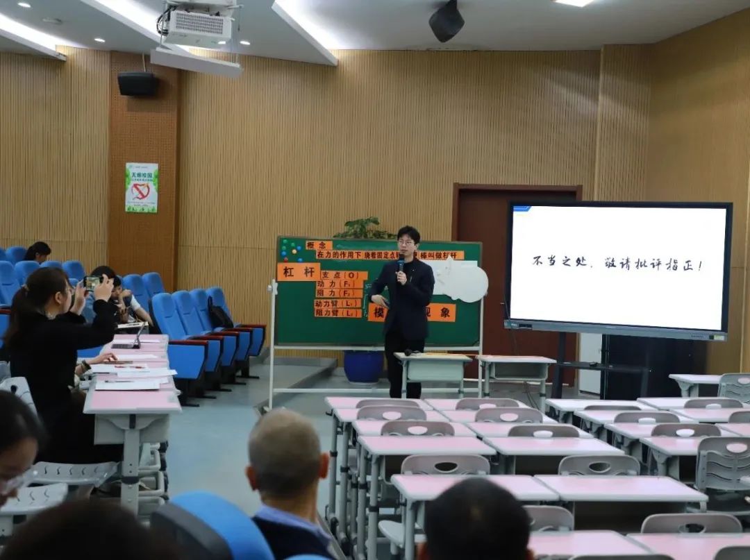 初中科学分会场上,永嘉县上塘城关中学的黄静老师带来了一节生动有趣的科学课——《用杠杆视角探究头-颈测力简化模型》。黄老师以“解决颈部肌肉酸的原因”为导入,引导学生在“简化模型”这一过程中自主推导出杠杠的概念。黄静老师别出心裁地设计了一个圆形杠杆,进一步探究了杠杠上力的作用效果的影响,帮助学生明确了力臂的概念,并将科学学科和数学学科深度融合。