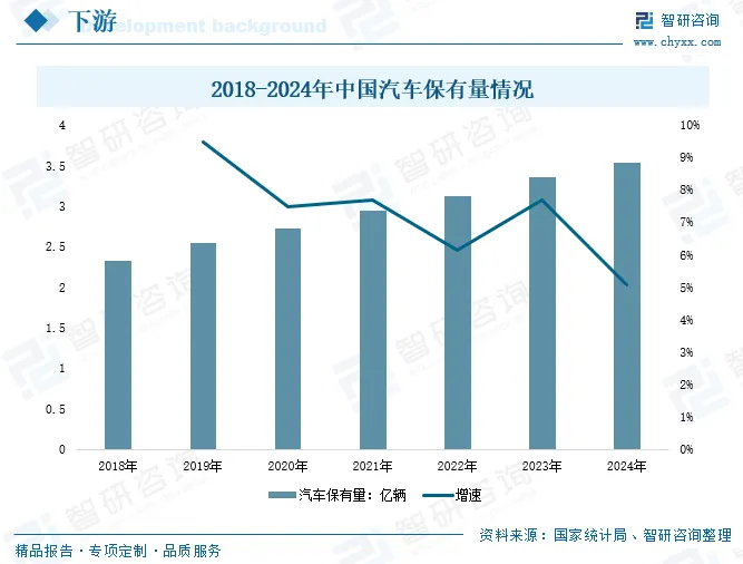 近年来,随着我国经济的持续发展和居民收入水平的不断提高,越来越多的家庭具备了购买汽车的经济能力。汽车作为提升生活品质的重要工具,其需求量自然水涨船高。根据国家统计局数据,2018-2024年中国汽车保有量持续上涨,2024年达到3.53亿辆,同比上涨5.1%。根据公安部数据,截至2025年9月底,中国汽车保有量达到3.6 亿辆,与2024年相比增加0.07亿辆。随着国内汽车保有量的持续增长,环保问题、能源紧张问题的不断凸显。在此背景下,国家产业政策的陆续出台,鼓励发展各类先进的排气后处理系统、废气再循环系统,大大增强了下游柴油车、汽油车市场对废气再循环技术的需求,汽车制造及发动机行业对废气再循环技术的需求将得到进一步释放。
