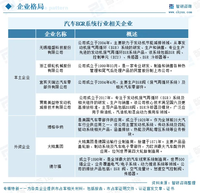 相比于西方对汽车EGR系统的研究来说,我国起步较晚,但是随着“双碳”时代的来临,我国不断加强对汽车EGR系统的研究,目前已经有了很大的进步。近年来,国内优势企业的迅速崛起,部分国内领先的汽车EGR系统企业通过多年的技术积累和市场开拓已在废气再循环行业形成一定的竞争优势,并且凭借现有的优势不断加大研发投入、研发新产品和持续改进产品性能,将设备技术的升级作为满足国家排放标准提高的基础。目前,行业内相关企业主要包括无锡隆盛科技股份有限公司、浙江银轮机械股份有限公司、宜宾天瑞达汽车零部件有限公司、渭南美益特发动机减排技术有限公司等本土企业,此外,还包括博格华纳、大陆集团、德尔福等外资企业。
