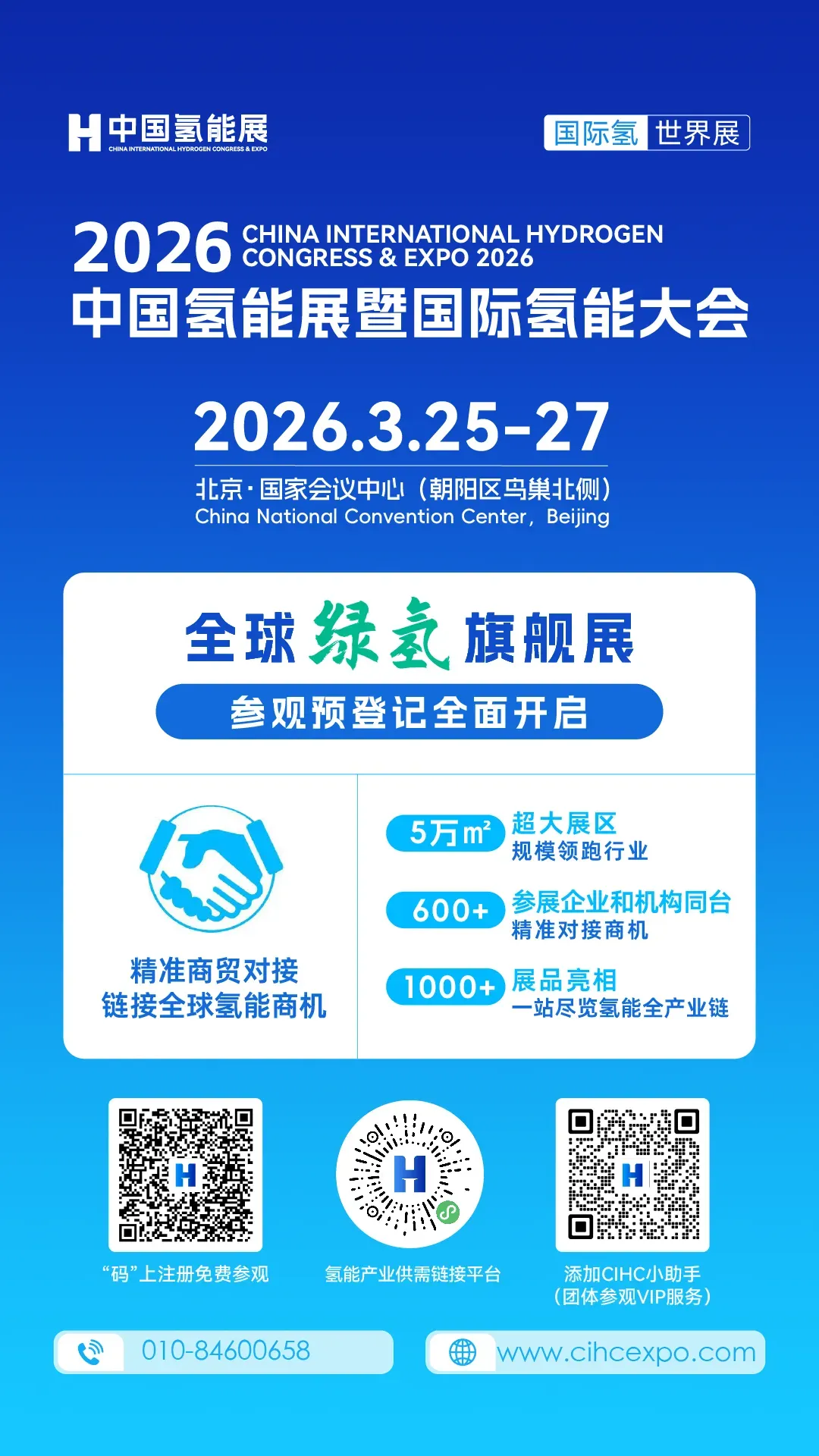 2026中国氢能展暨国际氢能大会(全称:2026中国国际氢能及燃料电池产业展览会暨国际氢能大会,英文全称:China International Hydrogen Congress & Expo 2026, 英文简称:CIHC 2026)由中国氢能联盟、中国电力企业联合会主办,中国建设行业贸促会会展部/北京泰格尔展览有限公司承办,定于2026年3月25日至27日在北京·国家会议中心(朝阳区鸟巢北侧)盛大举办。