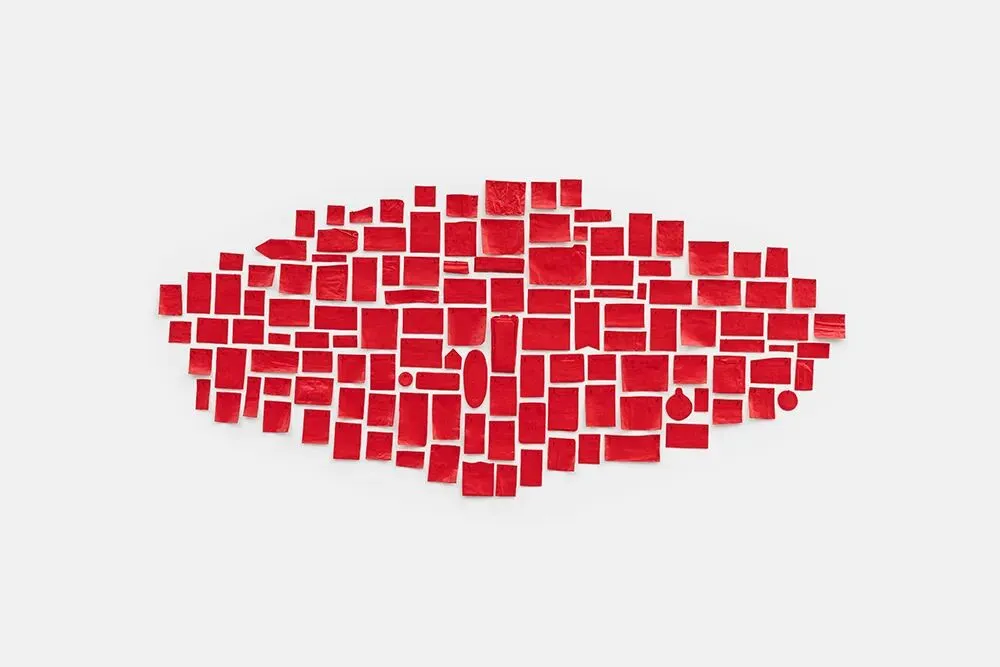 Red acrylic paint on newspaper clippings, cardboard, photographs, drawings, postcards, envelopes, tickets, vouchers, letters, drawings, posters, flyers, cards, recipes, napkins and steel pins on wall, 129 elements | 在剪报、纸板、照片、绘画、明信片、信封、门票、代金券、信件、绘画、海报、传单、卡片、食谱、餐巾纸和墙上的钢钉上涂上红色丙烯颜料,共129个