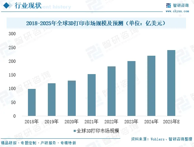 3D打印又称增材制造,是一种基于数字模型、通过逐层堆叠材料形成三维实体的革命性制造技术,与传统减材制造相比,具备设计自由度高、材料利用率高、能实现复杂结构制造等核心优势,已从早期原型制作拓展至规模化工业生产。近年来,全球市场保持稳健增长,2024年市场规模达219亿美元,同比增长9.31%,2018-2024年年复合增长率达14.34%;随着工业级应用渗透加深、多材料打印技术成熟,2025年全球市场规模预计将达到240亿美元。