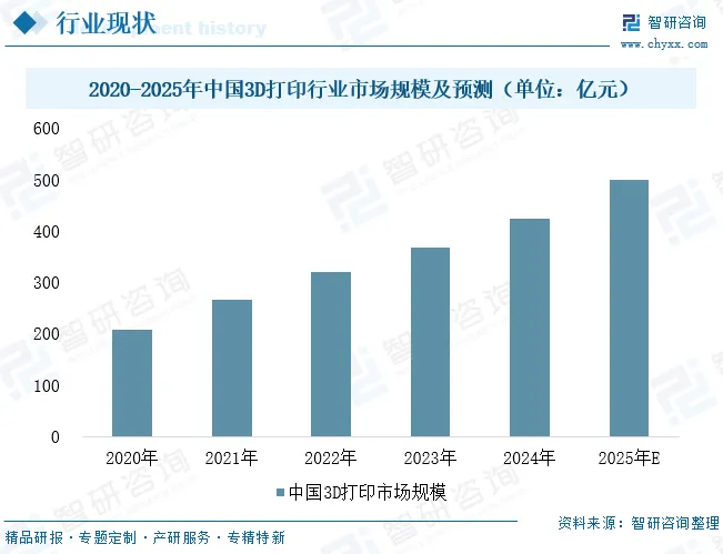在国内制造业转型升级的浪潮中,3D打印技术已成为关键支撑力量,广泛应用于航空航天、汽车、医疗、船舶、核工业等多个领域,既助力高端装备的研发创新,也高效满足个性化定制、快速原型制造等需求。国内市场增长势头尤为迅猛,2024年行业市场规模达423亿元,同比增长15.26%,增速显著高于全球平均水平;政策扶持、技术突破与下游需求共振,推动市场持续扩容,预计2025年市场规模将突破500亿元,工业级应用占比逐步提升,成为智能制造领域的核心增长极。