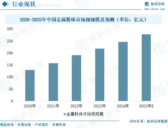 金属粉体是由微米甚至纳米量级金属颗粒组成的集合体,凭借高比表面积、高活性、可塑性强等特性,成为粉末冶金、3D打印、表面涂层、电子材料等领域的核心原材料,能通过成型与烧结工艺制备高性能金属材料或复合材料。我国金属粉体行业规模稳步扩大,2024年市场规模达244.9亿元;受益于3D打印、新能源等下游产业的快速发展,市场需求持续释放,2025年市场规模有望增至276.8亿元,其中3D打印专用金属粉体作为高附加值细分领域,占比持续提升,成为行业增长的重要引擎。