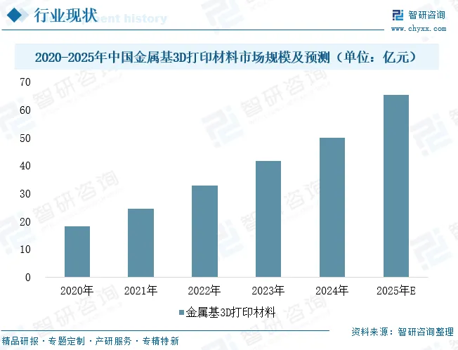 金属基3D打印材料是增材制造技术实现高端应用的核心。当前,航空航天、医疗等领域对复杂轻量化、功能集成化零部件的迫切需求,正倒逼该技术从实验室样件走向产业化批量生产。这一转变对设备精度、工艺自动化、生产效率与成本控制以及材料多样性提出了前所未有的更高要求。为支撑产业高质量发展,必须持续加大在装备、核心材料(如专用合金粉末)、工艺及关键部件上的创新力度,同时优化上下游供应链,并深化国际合作以构建自主可控的产业能力。在激光选区熔化(SLM)等工艺逐步成熟的推动下,2024年中国金属基3D打印材料市场规模约50亿元,预计2025年将增长至65.3亿元左右,行业正经历从“可以制造”到“稳定、高效、经济地制造”的关键跨越。