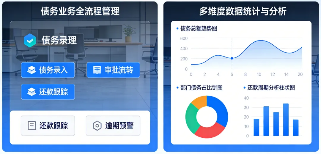 本系统面向企业内部管理场景,可根据企业实际管理需求,实现债务业务全流程闭环管理,并提供多维度数据统计与分析支撑,有效提升工作效率与数据准确性。