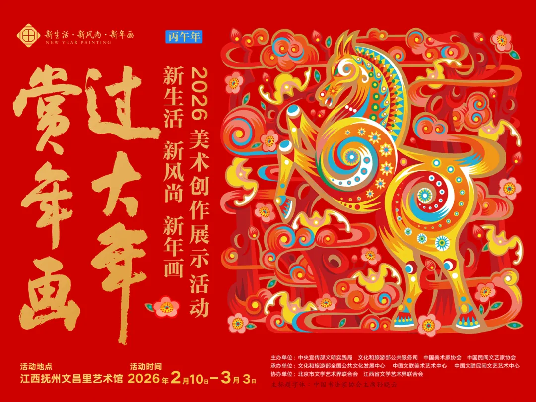 为深入学习贯彻党的二十届四中全会精神,传承弘扬中华优秀传统文化,丰富人民群众节日精神文化生活,激励广大群众振奋精气神、共创新生活,中央宣传部文明实践局、文化和旅游部公共服务司、中国美术家协会、中国民间文艺家协会联合举办了2026年“新生活·新风尚·新年画”美术创作展示活动。本次线上展览的作品,就是其中的精品佳作。它们色彩浓艳鲜明,手法精湛细腻,内容丰富,题材多样,既有传统祈福寓意,又焕发时代活力,呈现出欣欣向荣的多彩画卷和奋发有为的精神面貌,为新春佳节增添浓郁的文化气息与独特的艺术光彩。