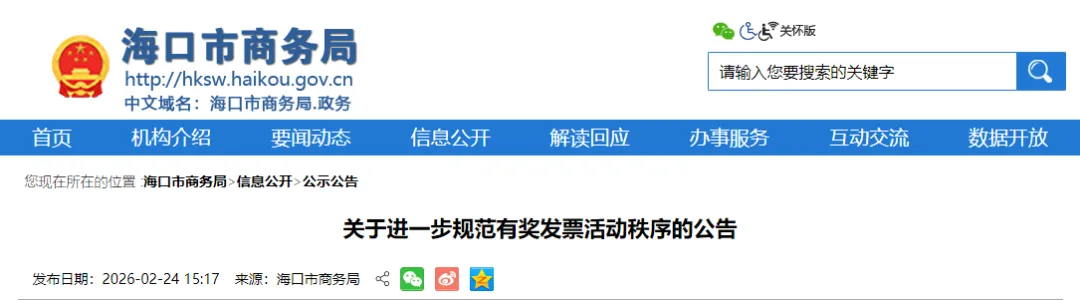 2月24日,海口市商务局发布关于进一步规范有奖发票活动秩序的公告。近期,在有奖发票活动开展过程中,发现个别消费者与商户存在开奖后违规红冲、作废发票等行为,违反活动规则,扰乱公平参与秩序,影响诚信消费环境。为维护活动公平公正,保障市民合法权益,根据有奖发票活动相关管理规定,已对存在违规行为的个别商户暂停参与本次活动资格。相关商户完成整改并通过评估后,将视情况恢复参与资格。同时,针对违规抽奖、恶意套利等行为,活动平台已建立全过程数据比对和风险监测机制。凡经核查认定存在违规参与、违规抽奖等情形的,将依法依规通过技术手段追回已发放奖金,并视情节采取取消参与资格、纳入异常名单等措施。