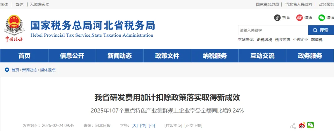 为落实好研发费用加计扣除政策,河北省税务局联合省科技厅推出智能化政策解读、自动化费用归集等多项服务举措,将研发项目事前鉴定试点扩至25个县(市、区),并结合产业集群规上企业的研发需求,组织税务专家开展“一对一”定制服务。2025年汇算清缴期间,107个重点特色产业集群规上企业享受研发费用加计扣除金额同比增长9.24%,有效助力县域特色产业转型升级。在服务经济社会发展中,河北省聚焦服务北京非首都功能疏解,持续优化迁移企业专班对接、事先裁定等做法,破解企业新老员工社保费跨系统重复申报等难题。同时,不断提升税收监管效能,持续完善制度机制和优化指标模型,强化互联网平台经营者监管,加强重点领域风险核查和稽查打击。下一步,河北省将紧扣国家重大战略研究提出税费支持措施,探索“京津冀+”税收协作模式,加大研发费用加计扣除等重点税费政策落实力度。同时,强化合规管理、严厉打击涉税违法行为,切实维护经营主体合法权益,以法治公平的税收环境,助推营商环境再升级。
