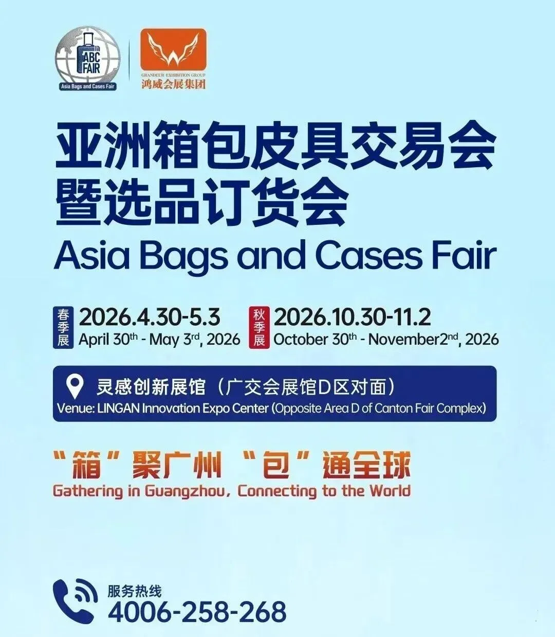 2026亚洲箱包皮具交易会以优质货源为核心、高效对接为纽带,邀全球箱包采购商齐聚广州,一站式落地跨境采购布局,助力好产品打通全球市场,让每一次赴展都满载商机与收获!