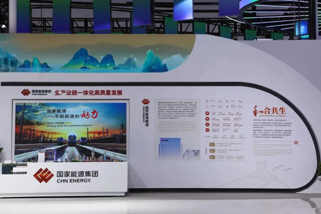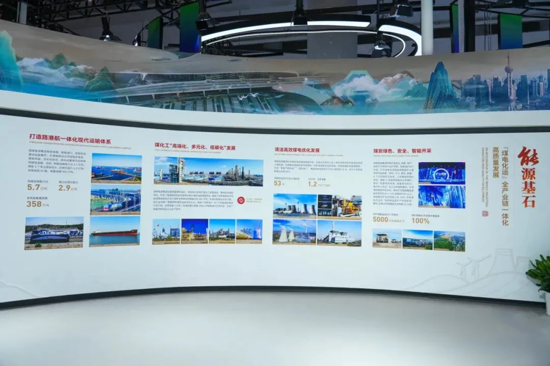该展区由“煤炭绿色、安全、智能开采”“清洁高效煤电优化发展”“煤化工‘高端化、多元化、低碳化’发展”“打造路港航一体化现代运输体系”四部分构成,用精彩的图文展现国家能源集团“煤电化运”全产业链一体化高质量发展的全过程。