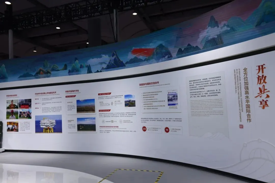 在国际上,国家能源集团坚持开放、共赢发展,切实承担起保障能源供应、推动绿色低碳转型的重要使命。该展区从“深度参与国际交流合作 ”“积极开拓海外市场”“开创中外合资海上风电建设先河”“积极承担国际社会责任”四个方面,展现国家能源集团多渠道开展国际科技项目合作,持续在双向开放中提升发展质量。