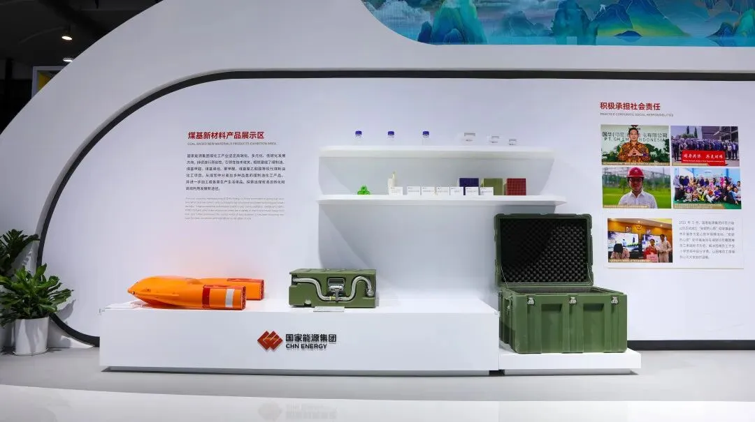 在产品展示区,军用储运箱、无伞空投油箱、水上智能救生艇等煤基新材料产品让路过参观者称奇。