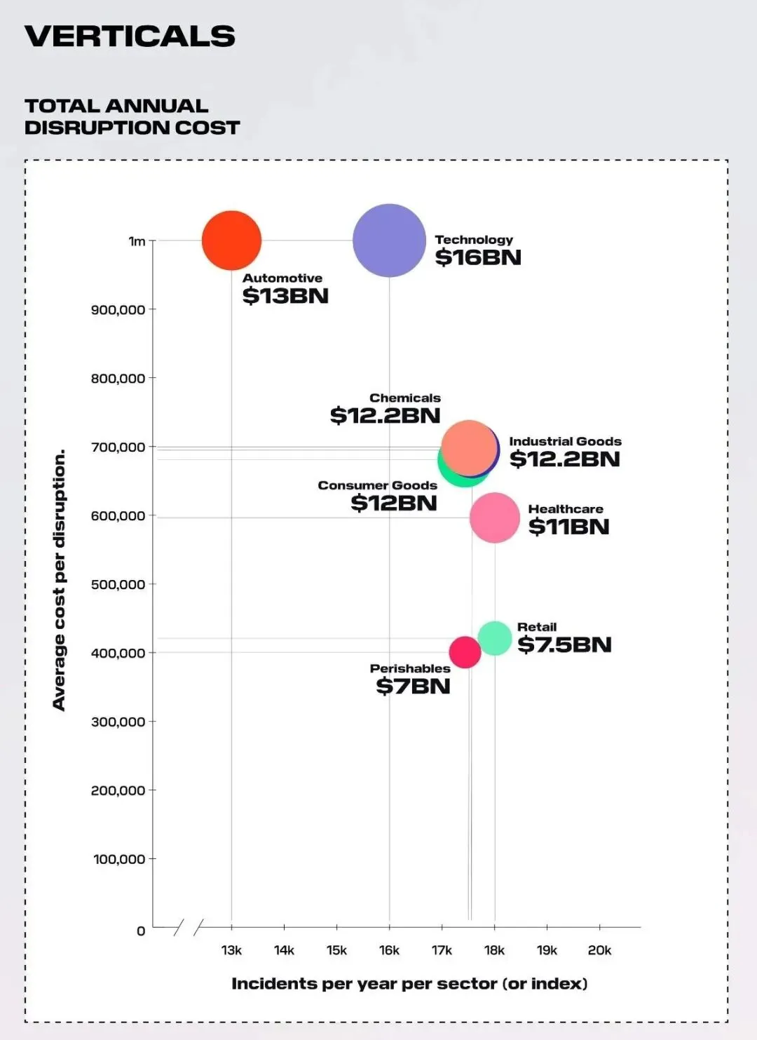 灾难性重击型:汽车、科技行业中断频次较低,但后果严重。汽车行业单次中断平均成本约100万美元,年损失高达130亿美元;科技行业年中断成本更是达到160亿美元,核心零部件短缺可能导致生产线长期停摆。