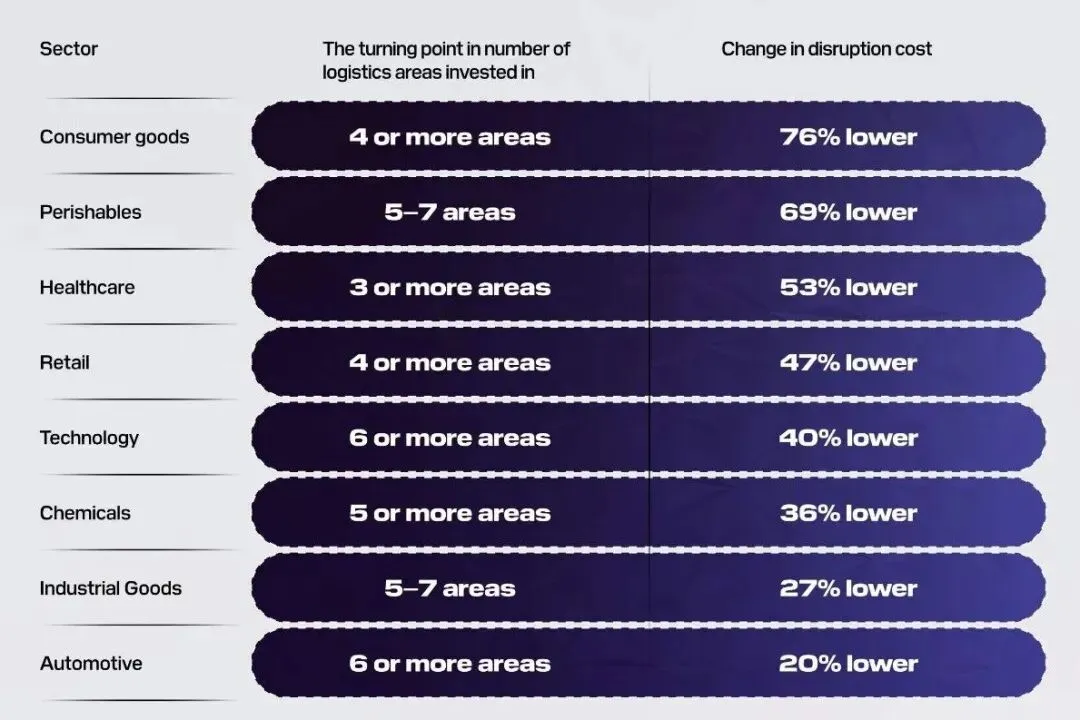 数据证明,最具韧性的企业从不依赖“单点突破”。消费品企业投资4个以上物流领域,中断成本可降低76%;零售企业优化生产输入规划与工厂物流,成本降幅达87%。基础物流能力(如仓储、入库流程)是核心,数字工具仅能放大效果,无法弥补基础薄弱的短板。