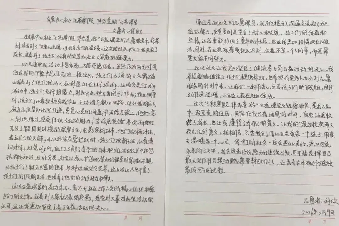 【寒假实践】2026年会展中心社区寒假大学生“返家乡”社会实践心得体会(三)——刘欣青春接力,薪火相传。本期展示的是志愿者刘欣的手写心得。从武术操练到垃圾分类宣讲,从书法练习到宝鸡发展线研学,她用文字定格了 “寒假公益课堂” 的多彩瞬间。与前几位志愿者一样,她在付出中收获成长,在陪伴中领悟真情。这份心得,是 “返家乡” 大学生们扎根社区、服务童心的又一生动写照。