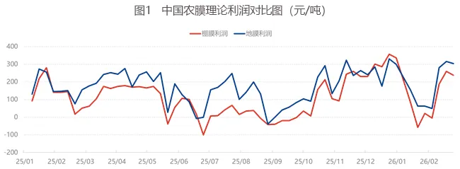 春节前后聚乙烯价格窄幅波动,农膜市场有价无市、价格平稳,带动理论利润上涨。节后原料涨价推高成本,但企业未全面复工、人员正月十五前后返岗,且制品调价滞后,农膜报价维持平稳。截至2月25日,华北双防膜主流价8500-9100元/吨。
