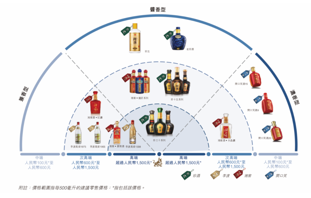 具体来讲,最早可追溯至1975年的旗舰品牌「珍酒」主要面向追求优质酱香型白酒产品的酱香型白酒爱好者,尤其是珍三十系列和珍十五系列已获得市场广泛认可和国际认可,现已拓展至中国31个省区;「李渡」专注生产和销售次高端及以上级别的兼香型白酒产品,代表产品包括李渡高粱1308、李渡高粱1955和李渡高粱1975;「湘窖」和「开口笑」则是湖南的地区领先品牌。其中,前者提供多种次高端白酒产品,包括浓香型、酱香型及兼香型;后者则主要提供面向中端市场的浓香型白酒产品。