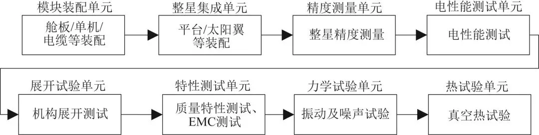 与原有卫星总装车间中以总装测试工位为中心的“技术岛”式布局不同,卫星柔性总装生产线是在产品模块化设计及工艺流程优化的基础上,进行生产线功能划分与布局设计,其包含了模块装配单元、整星集成单元、精度测量单元、电性能测试单元、特性测试单元等一系列柔性作业单元,并配置各类厂房设施、装配与检测设备、仓储物流设备、软件系统等,通过软硬件集成,实现生产线物流和信息流的整体贯通,生产线工作流程如图 1 所示。