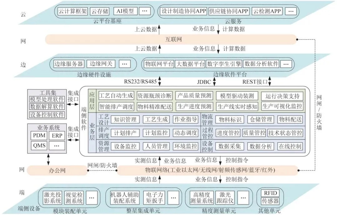 1)端:包含加工与装配设备、检测设备、物流设备、工艺装备、数据采集终端等生产线设备,以及总装工艺快速设计系统、生产线管控系统、模型处理软件、数据解算软件等软件系统。端侧软硬件通过物联网进行实测数据、业务信息和控制指令等的交互,实现工艺设计、排产调度、物料配送、制造执行、生产过程控制等功能。