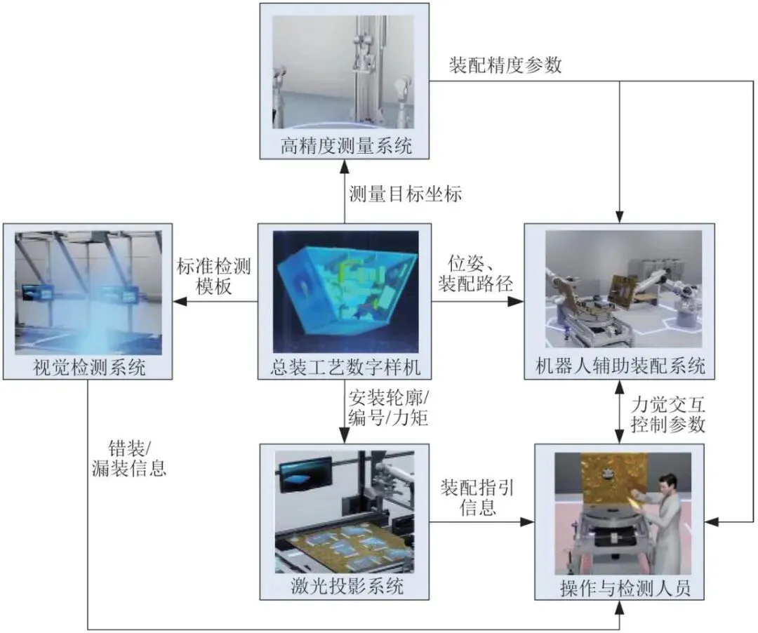 卫星总装过程中部分单机、电缆、热控部件装配以及整星集成、检测等工作一般由操作人员依据设计和工艺文件,操作设备或工具进行作业及结果确认。由于手工作业效率低且精度难以保证,导致上述环节成为制约生产线高效运行的瓶颈。为解决上述问题,采用模型驱动的人机协同装配与检测方法如图4 所示,通过模型处理软件提取卫星总装工艺数字样机中产品参数、装配关系及属性及工艺流程等信息,驱动装配与检测设备自动执行、数据在线采集分析以及人机协同控制。