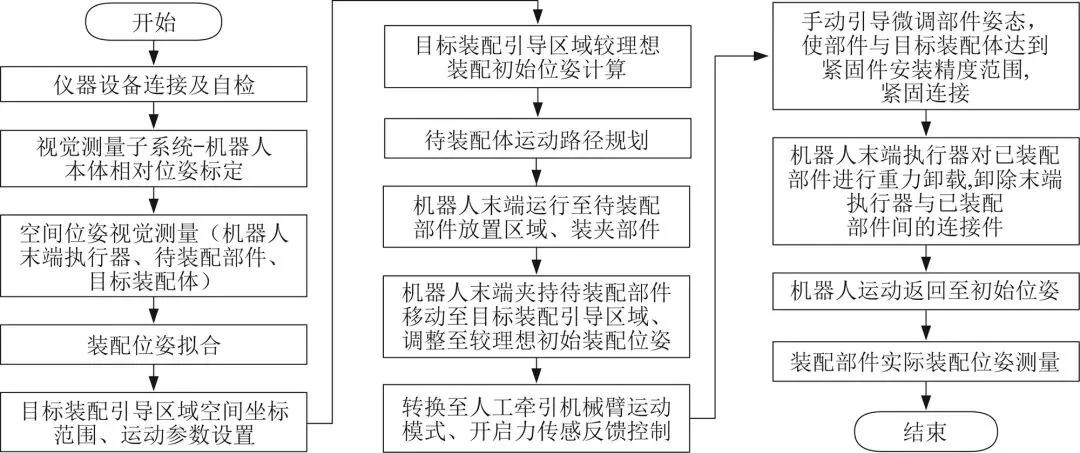 2)机器人辅助装配:在卫星平台、舱板、太阳翼等集成环节,采用视觉-力觉交互控制的机器人辅助装配方法,其流程如图 5 所示,通过机器人辅助装配系统中视觉检测模块对待装件及安装面进行视觉测量,获取其空间位姿信息,并同步至产品装配模型;基于产品装配进行装配仿真,实现装配位姿拟合及路径规划,并驱动机器人将待装件移动至装配初始位姿,然后通过力传感反馈控制和人机协同柔顺装配方式[33],实现精确调姿和精密装配。经测试,机器人辅助装配系统视觉测量精度 0.1 mm、末端力感知精度 8.5 N,通过视觉和力觉交互控制,装配定位精度 0.04 mm。