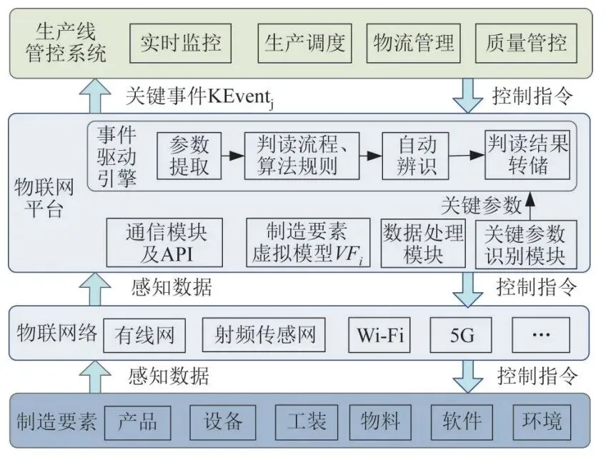 物联网平台采集的原始数据具有海量、多维度、高噪声、多源异构等特点,难以直接用于驱动生产线高效精准控制。因此,采用关键事件驱动的生产线实时感知方法如图6 所示,通过物联网平台中事件驱动引擎定义关键事件,进行关键参数采集、处理与辨识,获取关键事件感知结果,然后调用服务将关键事件消息推送至生产线管控系统等业务系统,实现生产线运行实时管控。关键事件定义如下:
