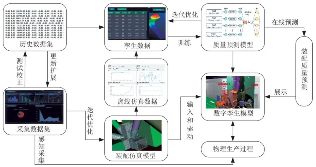 3)生产线运行状态预测:针对产品装配质量预测,为解决质量数据样本量小的问题,通过多学科仿真进行数据扩样,在此基础上,基于仿真数据和实测数据融合形成的孪生数据,利用深度时间卷积网络(Deep Temporal Convolutional Network,DTCN),构建产品装配质量预测代理模型,并将预测结果与设计值或风险阈值进行比对,从而实现产品装配质量的快速预测与风险预警,其流程如图 8所示。针对生产线运行状态预测,通过生产线孪生模型获取生产线布局、各关键要素的状态及位置等信息,根据工艺流程建立工序与资源间的映射关系、作业时间等参数并进行生产线运行仿真,获得未来一段时间内资源占用、物流路径、作业时间等数据,预测瓶颈及生产进度,对生产线运行效能与稳定性进行评估,并通过排产调度提前进行资源优化配置。