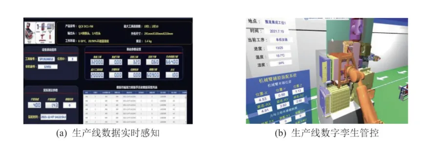 2)边缘层集成:端侧部署的总装工艺快速设计系统、生产线管控系统、物流管理系统等为 B/S 架构,通过 SDK、API、Web Service 等接口与边缘部署的物联网平台、大数据平台等集成,实现工艺设计、计划排产、物流管理等业务贯通;物联网平台包含制造要素虚拟建模、事件感知等模块,通过 JDBC、OD‑BC、ETL 等接口协议与大数据平台、数字孪生引擎等实现集成,实现生产线数据实时感知与管控,生产线数据实时感知与管控软件界面如图 11所示。
