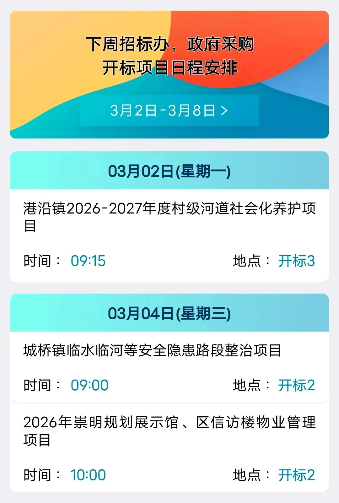 【日程安排】下周招标办、政府采购开标项目日程安排(3月2日-3月8日)