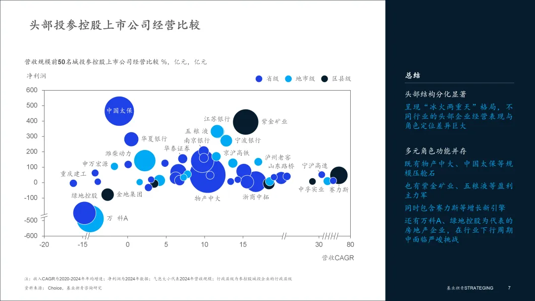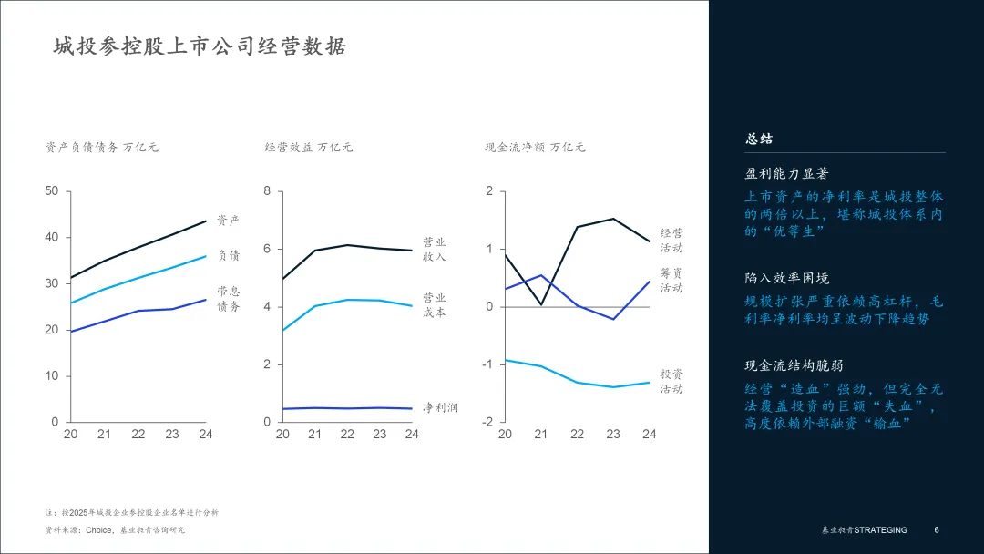 总体而言,城投参控股的上市公司军团,作为从城投母体中筛选出的“优等生”,整体展现了更强的盈利能力和健康的经营“造血”功能。但其自身的盈利效率下滑、依赖外部融资支撑大规模投资扩张的模式,以及头部企业在行业周期下的“冰火两重天”,也尖锐地指出,“城投+上市公司”的结合并非万能灵药,资产质量的结构性分化和周期性风险依然是重大挑战。
