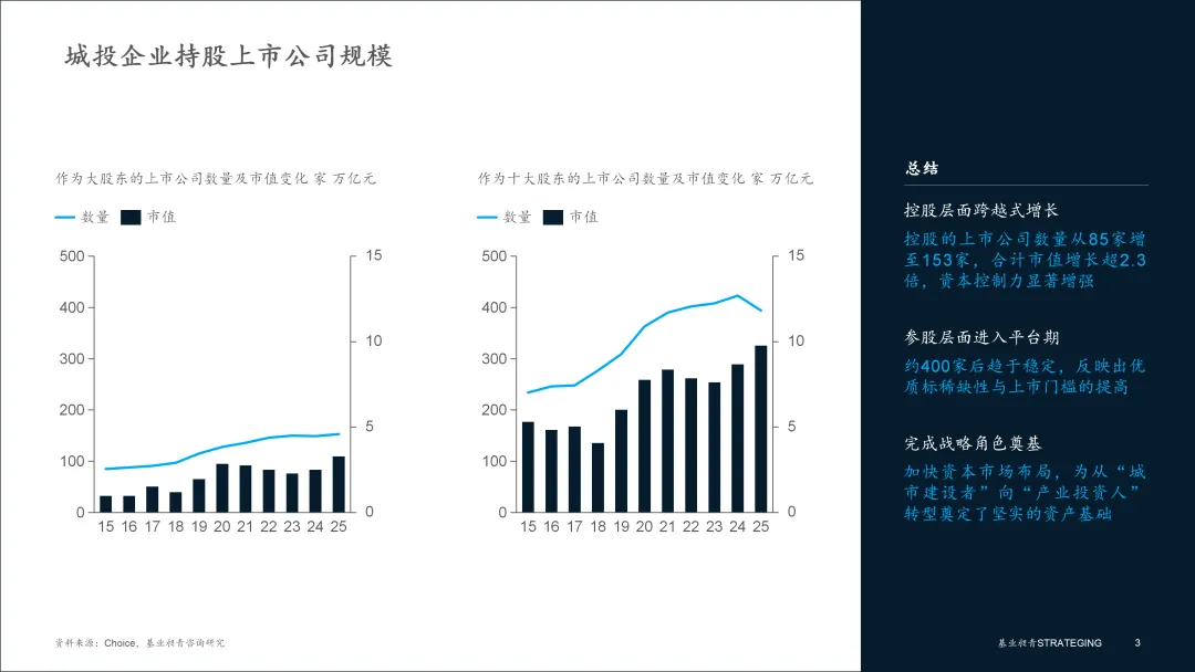2015至2025年的十年,是城投平台与资本市场融合从“浅尝輒止”到“深度绑定”的十年。无论是作为控股股东的“深度”,还是作为十大股东的“广度”,其参与数量和持有市值均呈现出显著的扩张态势,清晰地勾勒出城投从传统基建向产业经营转型的坚定步伐。