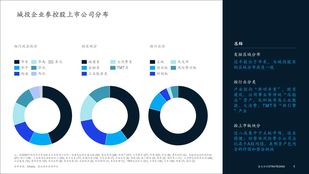 总体而言,城投持股的上市公司呈现“立足华东、深耕主板、渗透新兴”的战略格局。以主板成熟企业保障基本盘稳定,同时试水新引擎产业,但其高于市场平均的风险警示公司比例也提示我们,这份资产包在带来机遇的同时,也内含着不容忽视的整合与纾困挑战。