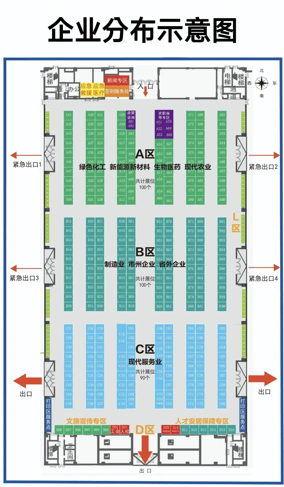 1.会场设置。现场设置 A、B、C、D、L五个展区,其中 A 区布局绿色化工、生物医药、新能源、 新材料、现代农业类企业;B区布局制造业、市州、外省等企业; C区布局现代服务业、教育卫生类企业;D区布局文旅宣传专区、人才安居保障专区;L区为临展企业区域。