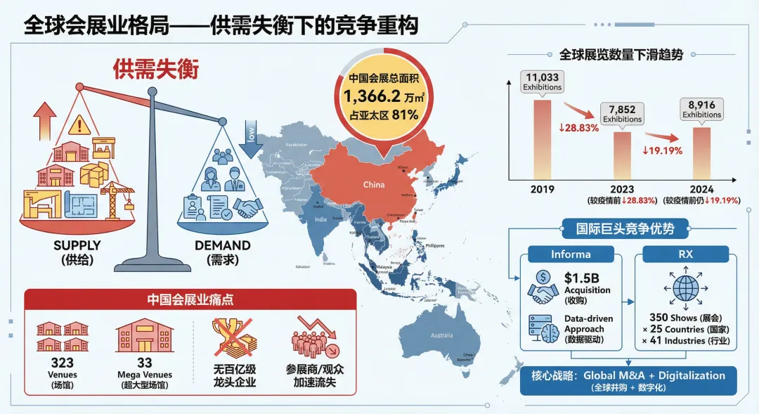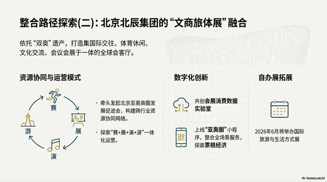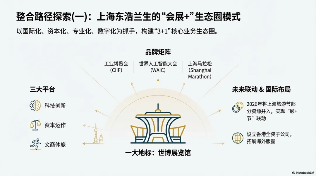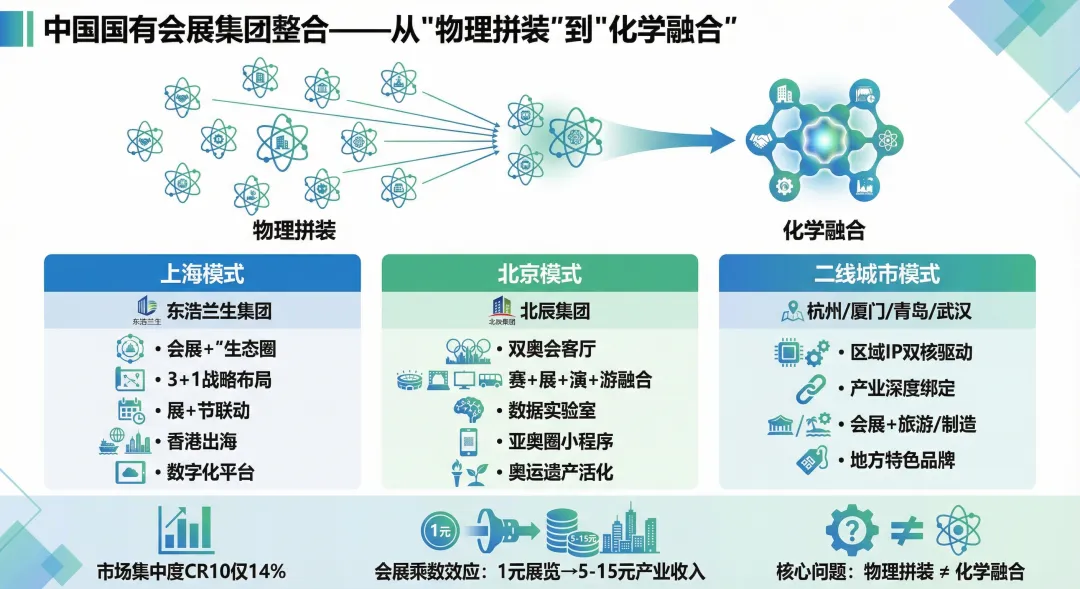 全球会展业正经历深刻的结构性调整。根据UFI联合德国jwc会展咨询发布的《2025世界展览场馆地图》,中国以1,366.2万平方米的展馆可展出面积占据亚太地区81.0%,拥有323座场馆,其中33座为超大型场馆,是名副其实的“巨无霸”。然而,场馆供给的快速扩张与有效需求之间的矛盾日益突出。中国会展场馆的平均使用率仍有较大提升空间,部分二三线城市新建场馆面临招展困难的窘境。与此同时,展商和专业观众的流失正在成为全球性挑战——企业参展预算收紧、数字化替代效应显现、碎片化营销渠道分流,传统展会模式面临前所未有的考验。展会项目的大幅减少,是会展业下行的主要原因,其中政府展减少、小型展会大幅度减少(2万平以下的)、二线城市展会减少最为明显。面对市场变局,国际会展巨头选择了一条截然不同的发展路径:以资本为纽带,通过持续并购实现规模扩张和全球布局。英富曼集团自成立以来收购了数十家行业内公司,2024年更以15亿美元收购艾盛集团,进一步巩固其全球领导地位。励展博览集团在41个行业,跨越25个国家和地区举办约350场展会。值得注意的是,这两大会展巨头的母公司——英富曼集团(Informa)和励讯集团(RELX)——本质上都是信息和数据服务公司。它们的核心竞争力在于对客户需求的深度理解、对行业数据的系统积累,以及将“数据驱动”理念贯穿于展会策划、招商招展、观众运营全流程的能力。这一模式对中国会展企业的转型升级具有重要启示意义。中国会展业在集中度不断提高的基础上,依然存在“分散、大而不强”的格局。根据励展博览集团(RX)大中华区首席运营官李雅仪女士(Josephine Lee)在三新展开幕主旨演讲提到了当前会展行业的三大颠覆因素(全球动荡、新兴市场+内卷、盈利模式迭代),其中,按办展面积计算,中国境内办展CR10仅为14%左右(国内一个行业最大的Top 10展会的面积占据市场份额只有14%)。(图:三新展励展博览集团(RX)大中华区首席运营官李雅仪女士)市场集中度远低于国际水平,而办展数量数十倍高于欧美。分散的资源配置不仅难以形成规模效应,更制约了品牌展会的培育和国际竞争力的提升。对于城市而言,会展经济具有显著的乘数效应——1元展览净面积营业额可带动5-15元相关产业收入。因此,各地政府纷纷将会展业作为推动经济高质量发展的重要抓手。然而,分散的会展资源难以形成城市会展竞争力,也难以在国际市场上发出中国声音。整合重组、做大做强,已成为地方国有会展集团的必然选择。东浩兰生集团是上海市属国有骨干企业,2013年由东浩集团与兰生集团联合重组成立。东浩兰生的整合路径具有鲜明特色:以国际化、资本化、专业化、数字化为工作抓手,聚焦“科技服务”、“体育赛事”、“高端装备”、“大健康”、“宠物经济”等赛道,提升公司核心竞争力。据悉,2026年将正式将上海旅游节的部分运营资源并入会展板块,实现"展+节"联动;继续承办世界人工智能大会(WAIC)、上海马拉松等标志性项目,形成品牌矩阵;设立香港全资子公司,拓展国际业务版图;贯彻“三大平台、一大地标”战略,即聚焦资本运作、科技创新、文商体旅三大平台,形成以工博会、世界人工智能大会、上海马拉松、世博展览馆为主体的“3+1”核心业务生态圈。“十五五”期间,北京奥林匹克中心区将全面升级,北辰集团正积极打造集国际交往、体育休闲、文化交流、会议会展于一体的全球“双奥”会客厅。北辰集团牵头发起设立北京亚奥商圈发展促进会,汇聚政府部门、文化场馆、龙头企业等核心成员,构建起跨行业、全链条的资源协同网络,形成“赛+展+演+游”一体化运营模式,具体业务模式尚在探索。在数字化方面,北辰集团联合北京邮电大学、北京电信等资源共创会展消费数据实验室,旨在整合公共数据资源、会展行业数据资源、亚奥区域消费数据等,上线“亚奥圈”小程序,整合场馆预约、活动报名、住宿餐饮、游玩攻略、探索票根经济等全场景服务,打造“一机在手,玩转亚奥”的沉浸式体验。自办展方面,除了服贸会之外,通过收购、培育等方式,拥有多个行业领先的B2B品牌展,首都会展将于2026年6月举办国际旅游与生活方式展。- 2024年,杭州市会展集团的整合,以市级产业平台为定位,围绕“百年西博会”和“全球数贸会”两大核心IP实施“双核驱动”,最终服务于打造国际“赛”“会”之城。