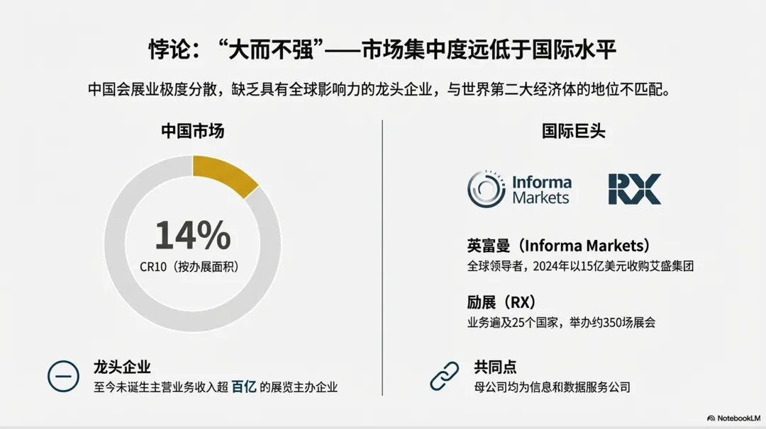 这一判断的核心依据在于:中国至今尚未诞生展览主办主营业务收入超过百亿元的龙头企业。反观英国市场,英富曼集团(Informa Markets)和励展博览集团(RX)都进入了百亿人民币俱乐部。这种“大而不强”的现状,与中国作为全球第二大经济体、第一大货物贸易国的地位不匹配。展望“十五五”时期(2026-2030年),地方国有会展集团纷纷谋划做大做强,整合重组,走大集团化发展道路,从目前的新闻报道和企业年报来看已成为不可逆转的产业趋势。