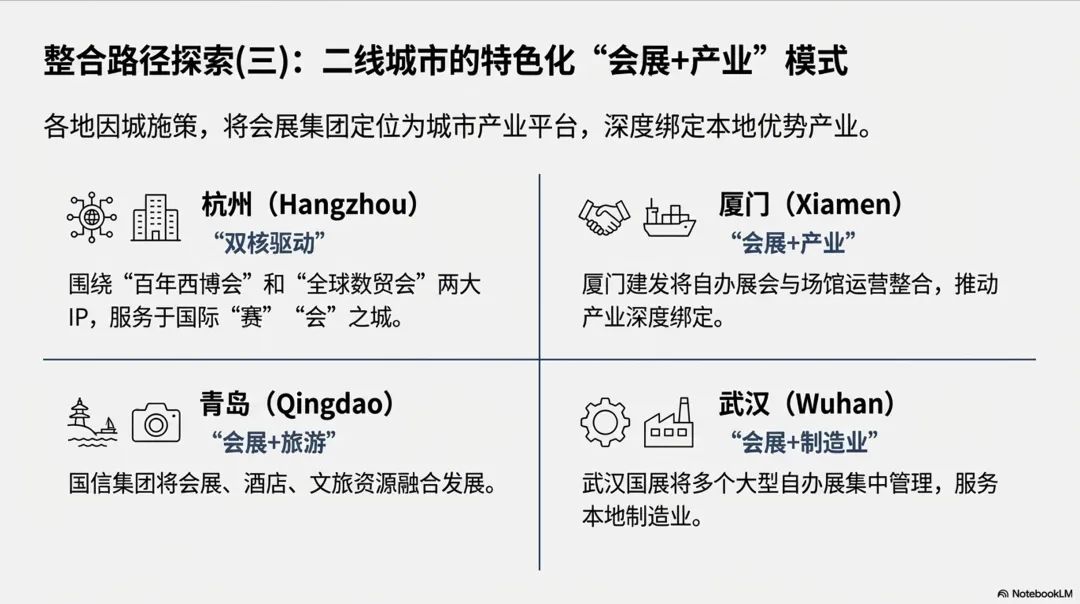- 厦门建发会展的产业深度绑定,将多个自办展会资源整合进会展集团,统一管理场馆与展会运营,推动“会展+产业”模式。