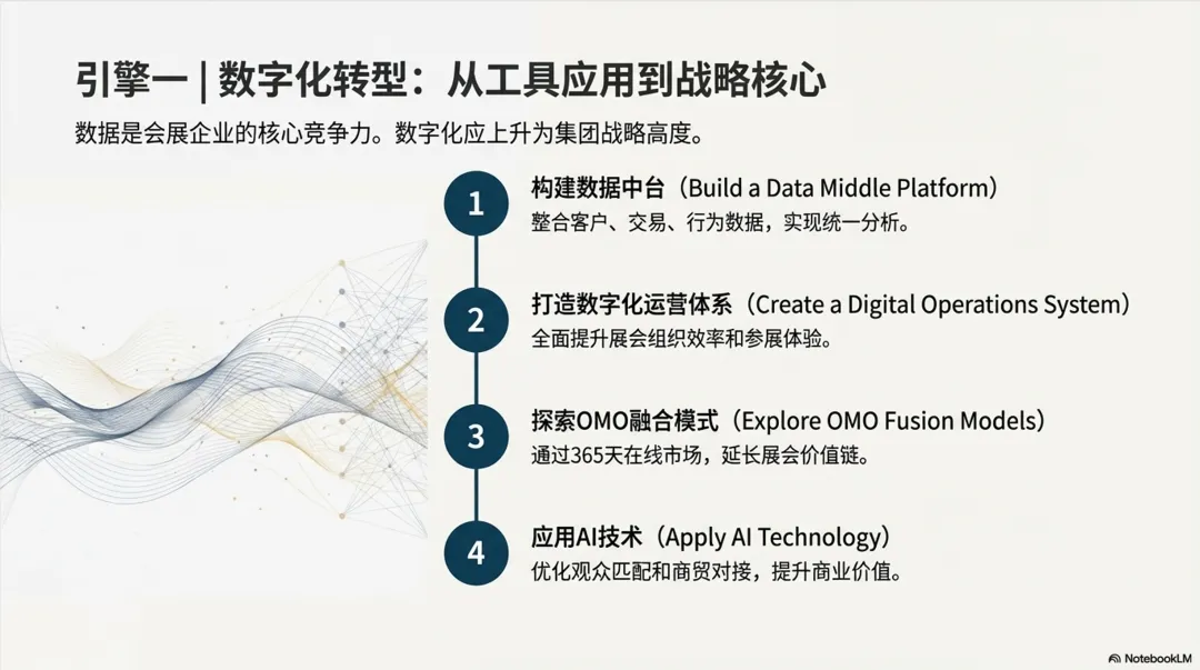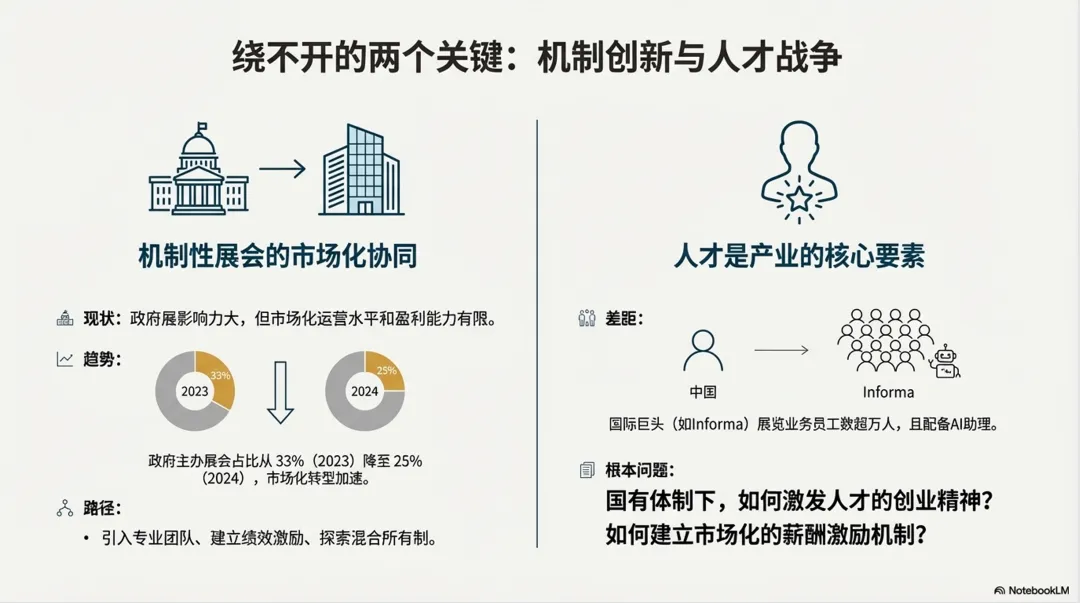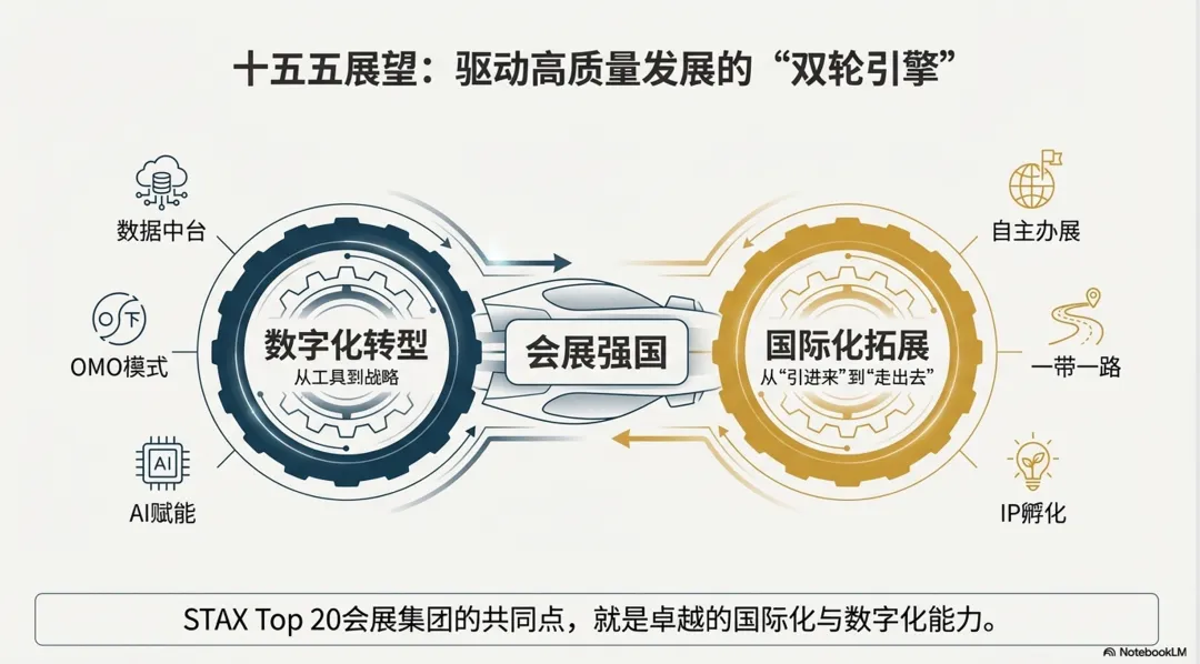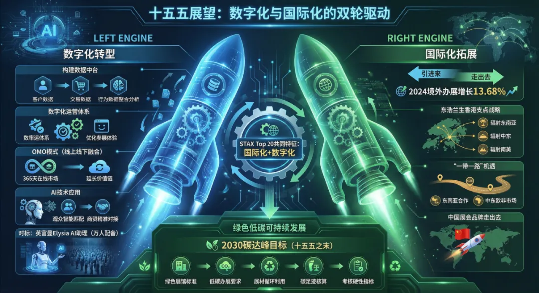 目前,多数国有会展集团的整合仍处于“物理拼装”阶段——将分散的资源放在一起,但尚未实现高效的项目协同和价值重塑。这与国际巨头通过资本并购实现的深度整合存在本质区别。英富曼、励展等企业的并购逻辑非常清晰:要么从市场角度收购目标国家的大型会展企业,要么从行业和地区方向锁定目标领域的优秀展会IP。对于国有会展集团而言,下一步的关键在于:要么如何打造一个强有力的标杆IP,要么如何将多个展会品牌形成合力?如何构建统一的客户服务体系?如何实现数据资产的共享与增值?如何培育具有国际影响力的自主展会IP?在这条道路上,英富曼也在整合,提出One Informa战略。这些问题的答案,将决定整合的最终成效。根据Stax 9月份发布的排名研究,机制性主办方在盈利能力和市场化水平上与上市公司和民营商业主办方存在一定差距。这一现象在中国表现也很突出——政府展虽然规模庞大、影响力广泛,但市场化运营水平有限,盈利能力不足。中国贸促会今年1月发布的《中国展览经济发展报告2024》显示:2024年的数据显示,政府主办展会项目数量占比由2023年的33%下降到25%,展览业市场化转型步伐不断加快。如何在保持机制性展会政策功能和公共服务属性的同时,提升其市场化运营水平和可持续发展能力,是国有会展集团必须破解的难题。可行的路径包括:引入专业团队进行活动策划和商业开发、建立绩效考核激励机制、探索混合所有制改革等。会展是关于人的聚合的产业。展会的成功与否,归根结底取决于人——人才的专业能力、人的创业精神、人的创意思维、人脉资源的积累与运用。与国际龙头相比,中国会展企业在人员配置上仍存在较大差距。英富曼、励展在展览业务方面的员工人数均达数千人,英富曼超过1.6万人,且人人都配备AI智能体助理Elysia。更深层次的问题在于:国有体制下,如何激发人才的创业精神和创新活力?如何建立市场化的薪酬激励机制?如何吸引和留住优秀的会展专业人才?这些问题不解决,再完美的整合方案也难以落地生根。STAX Top 20会展集团显示,这些大而强的集团有一个普遍共同点,那就是国际化(出海)和数字化做的比较优秀。对于国有会展集团而言,数字化转型不应仅仅停留在工具层面,而应上升为战略高度。核心在于:构建数据中台,实现客户数据、交易数据、行为数据的整合分析;打造数字化运营体系,提升展会组织效率和参展体验;探索线上线下融合(OMO)模式,通过365在线市场延长展会价值链;运用AI技术优化观众匹配和商贸对接。正如国际巨头的发展历程所揭示的——数据是会展企业的核心竞争力。截至2024年底,境外自主办展数量攀升,增幅达13.68%。东浩兰生会展集团在香港设立全资子公司,计划以香港为支点,辐射东南亚、中东、南美等地区,与海外头部会展公司共同孵化开发新的会展IP项目。然而,与英富曼、励展等国际巨头相比,中国会展企业的境外办展规模仍有较大差距。“十五五”期间,国有会展集团积极把握“一带一路”机遇(东南亚、中东欧非),加强与沿线国家的会展合作或融合,推动中国展会品牌“走出去”。绿色低碳会展已成为全球趋势和要件——因为2030碳达峰正好落脚在十五五之末。“十五五”期间,推广绿色展馆、低碳办展标准,探索展材循环利用、碳足迹核算等绿色实践,将成为国有会展集团提升竞争力的考核要素,甚至硬性指标。回望过去,中国会展业经历了从无到有、从小到大的跨越式发展。展望未来,从“会展大国”向“会展强国”,需要的不仅是规模的扩张,更是质量的提升、模式的创新、能力的跃迁。