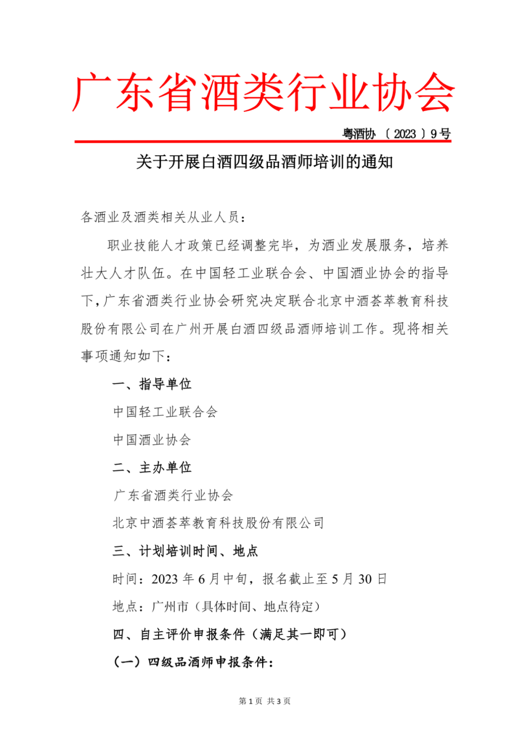 关于开展白酒四级品酒师培训的通知