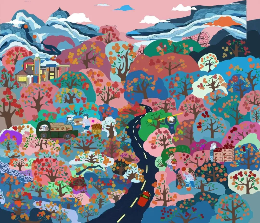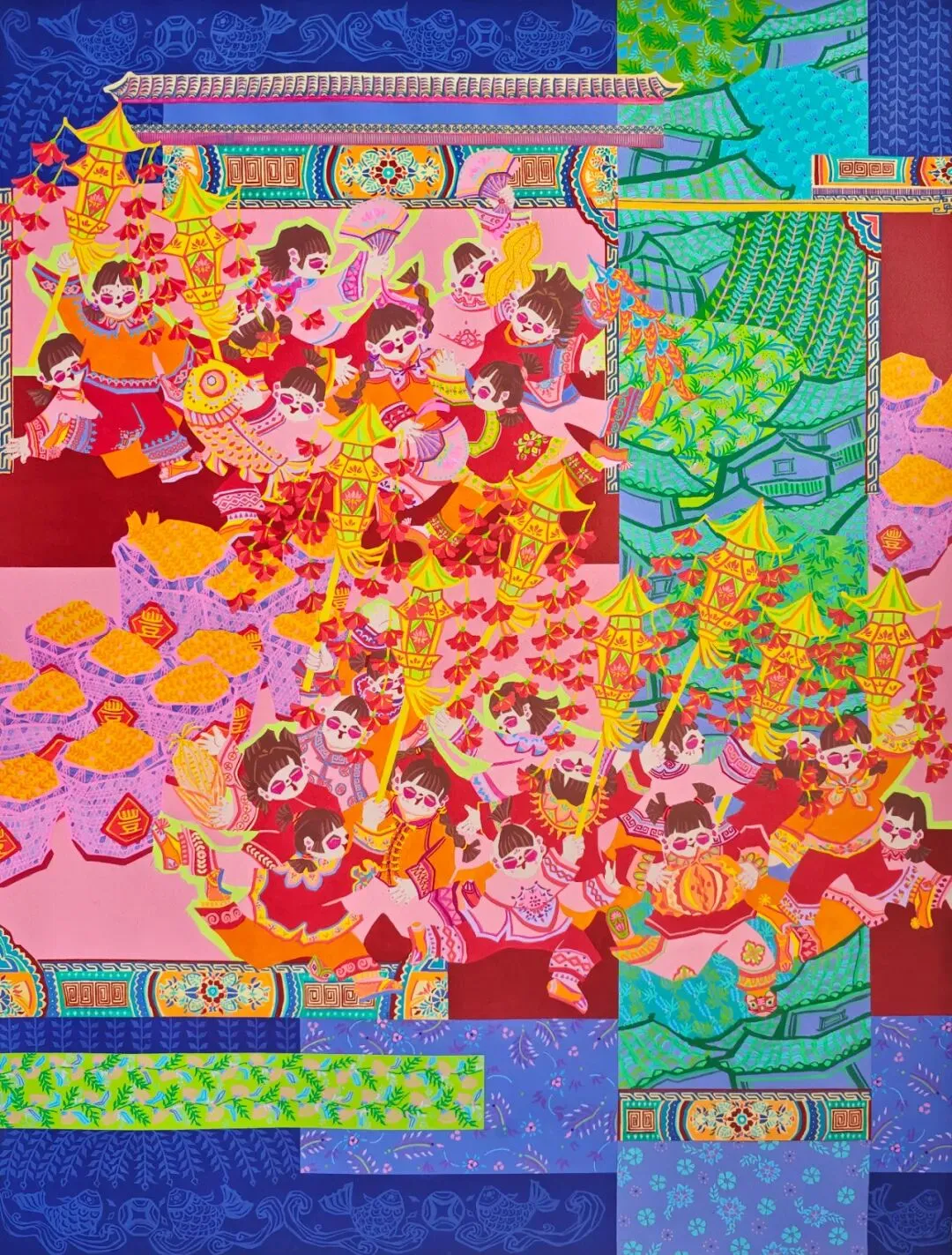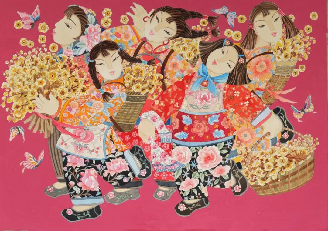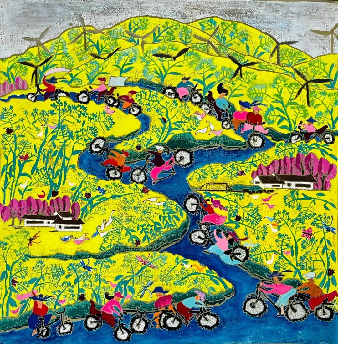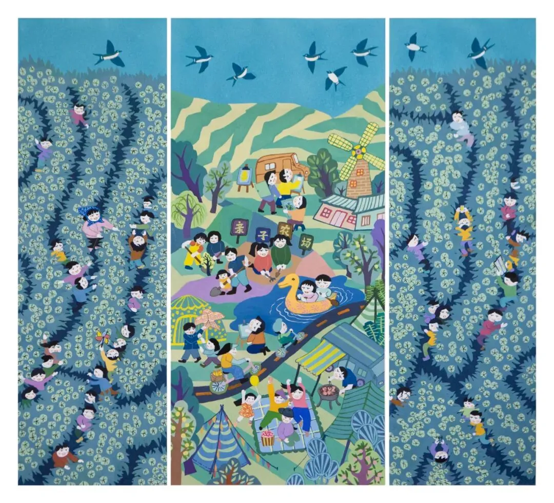 今天,在乡村振兴的时代号角里,农民画迎来了又一次“破土”。内蒙古自治区文化馆、浙江省文化馆、山东省文化馆、重庆市群众艺术馆、贵州省文化馆、新疆维吾尔自治区文化馆六家省级“文化会客厅”携手联动,策划“艺术点亮乡村——首届‘农民画’省际交流活动”。展览收到六省(区、市)数百位农民画作者投稿178幅,遴选120 幅精品集中呈现。它们带着泥土的芬芳、海风的咸鲜、高原的旷远、水乡的温润,共同拼贴出一幅“万里河山即画布”的当代《耕织图》。